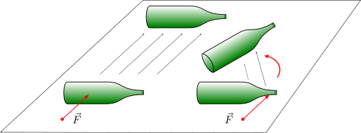 Ad esempio, consideriamo una bottiglia posta orizzontalmente sul pavimento; supponiamo di applicare una forza al centro della bottiglia: la forza provocherà uno spostamento della bottiglia lungo il piano; se, invece, applichiamo una forza sul collo della bottiglia, provocheremo una rotazione di essa.