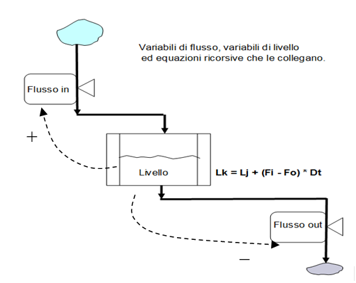 Avremo dunque le variabili di flusso che influenzano i livelli (tratto continuo) e le variabili di livello che influenzano i flussi attraverso interazioni informative (tratteggiate). In figura il segno “+” rappresenta un circuito di retroazione (feed-back) positivo, mentre il segno (-) un circuito di retroazione negativa. Con le nuvolette si rappresentano variabili di livello esterne al sistema in studio, che non vengono quindi prese in considerazione.